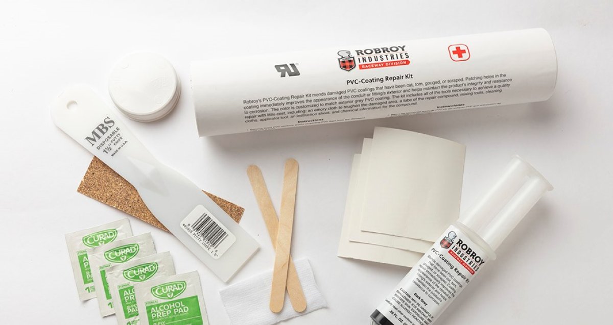 Robroy Industries, a manufacturer of electrical products including PVC-coated conduit, fittings, and accessories has released a new PVC Coating Repair Kit to mend coating damage that may occur in the field after product is installed. This Repair Kit differs from their traditional PVC touch-up compound as it is formulated to adhere to bare metal unlike the touch-up compound.
